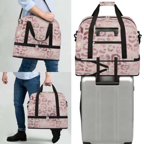 Leopard Print Cheetah Rose Gold Travel Duffle, Sports Gym Bag With Shoes Compartment, Weekender Overnight for Women Men 3