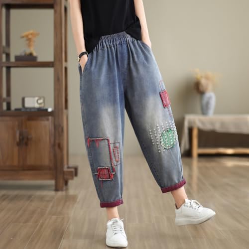 Women Retro Embroidered Loose Jeans Casual Ripped Jeans Harem Pants 4