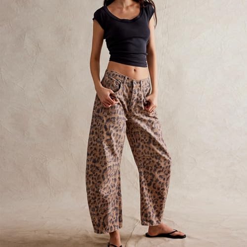 HOT ! Leopard Barrel Jeans Women Leopard Print Y2k Pants Mid Rise Vintage Loose Wide Leg Trousers with Pockets