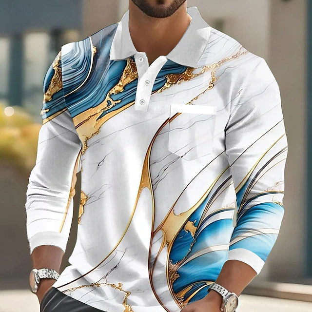 More information about Men's Marble Polo Long Sleeve Polo Shirts Collared Shirts Casual Business Athleisure Daily Wear Pocket 3D Print Buttons Spring Fall Winter Red Blue Purple