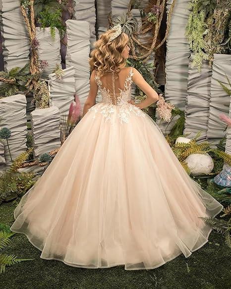 • DESIGN FEATURES: This flower girl dress is made of tulle fabric, floor length first communion dress ,scoop neck princess pageant dress sleeveless , A line girls wedding guest dress , elegant girls formal dress with lace appliques, prom dresses for teens girls ball gown , Your little princess will be excited about this tulle dress.