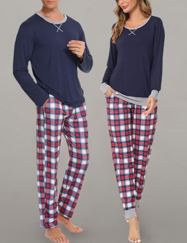 SWOMOG Men & Women Pajama Sets for Couples Long Sleeve Sleepwear Top Plaid Pants Loungewear Set with Pockets 1