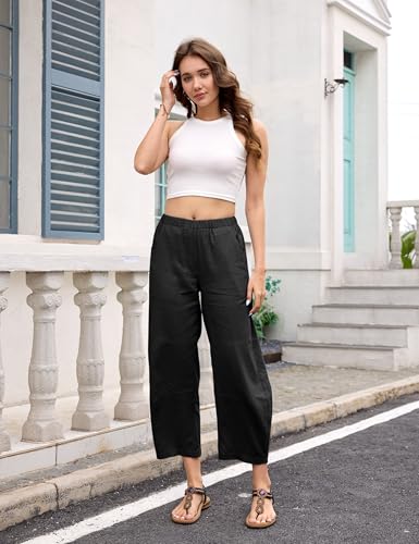 Lviefent Womens Wide Leg Barrel Pants Casual Elastic Waist Linen Cropped Harem Pants Trouser with Pockets 1