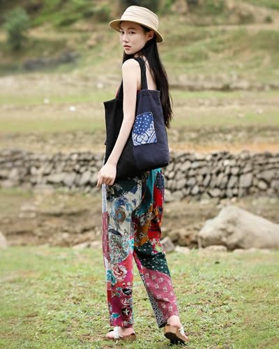 Women's Patchwork Harem Pants Cotton-Linen Blend Boho Trousers Hippie Pants with Pockets Fall Winter 2