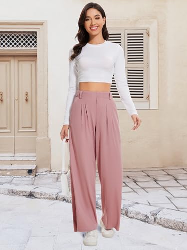 HOT ! AVAMO High Waisted Slacks for Women Elastic Business Casual Pants Stretchy Work Pants with Pockets Wide Leg Waffle Pink S