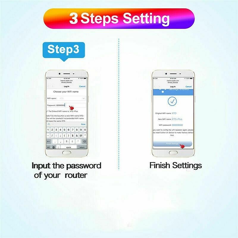 Highlights Product Selling Points: 1. Easy Setup: Simply plug the repeater into a socket and connect to the dedicated wifi network. No complicated installation process is required. 2. Wide Compatibility: Works with most WiFi routers that support IEEE 802.11N/G/B, ensuring compatibility with a wide range of devices. 3. High-speed Connection: Provides wireless-N speeds of up to 3000/2000/1200/300Mbps, delivering fast and stable internet connections. 4. Multiple Modes: Supports both access point and repeater modes, allowing you to choose the mode that best suits your needs. 5. Secure Connection: Offers various encryption options, including WEP, WPA/WPA2, and WPA-PSK/WPA2-PSK, ensuring that your network is secure. 6. One-key Connection: Can be easily set up if your WiFi router has a WPS button, making the process quick and hassle-free. 7. User-friendly Interface: The setup process can be easily completed through a browser, with clear instructions provided. 8. Customizability: Gives you the option to change the repeater SSID and enter your home WiFi password, providing personalized settings. 9. Reliable Performance: Once connected, the repeater boosts your existing WiFi signal, extending the range and improving overall signal strength. 10. Versatile Usage: Can be used both at home and in various settings, such as offices or cafes, to ensure a strong and stable WiFi connection.