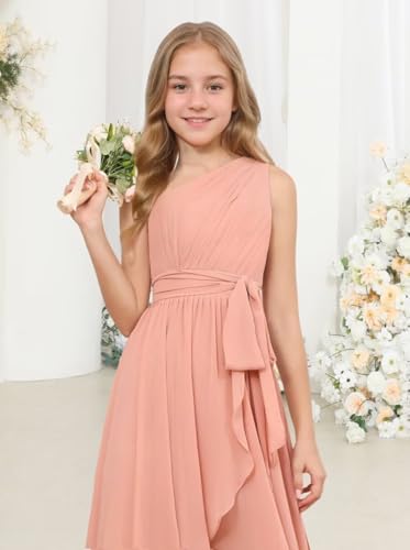 • Features: One shoulder designed junior bridesmaid dress that makes you both elegant and charming. This elegant chiffon bridesmaid dress for girls, with a belt, is a graceful long evening gown. A formal flower girl dress with an A-shaped single-sided slit design, with one side slit, creating a perfect look for your girl. Long junior bridesmaid dresses are the best choice for different occasions.