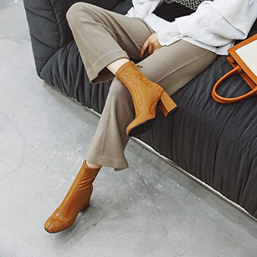 VOKLIN Women's Square Toe Dressy Ankle Boots Patent Leather Zipper Chunky High Heel Western Short Booties 5