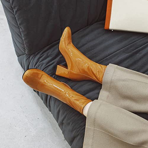 • ➤MEASUREMENTS】: 2.95"Chunky Block High Heel; 6.3"Shaft Height from arch; Boot Opening 8.27"around; High-Quality Patent Leather Upper Material; Cozy Breathable Velvet Lining.