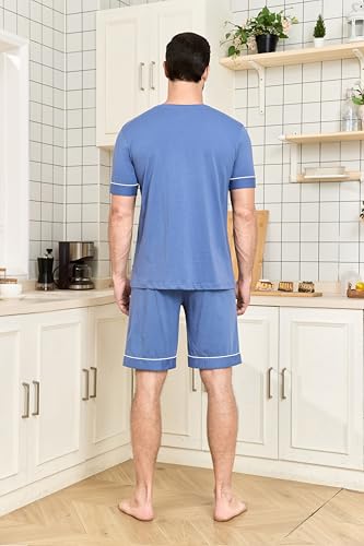 • ELASTIC WAIST SHORTS:Classic mens loungewear sets features an elasticized drawstring waistband,two side pockets.Drawstring can adjust to fit for everyday comfort .Men's sleepwear with spaciou pockets are enough to put the keys,mobile phone and other stuffs,and can also be a good display of stylish poses when putting your hands in it.