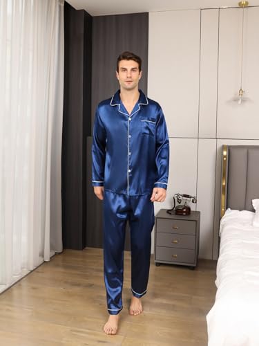 • 【UNIQUE DESIGN】: The men's silk pajamas sets/sleepwear with notch collar, button up, long sleeve pajama shirt, and one chest pocket design. Comfy Pajama pants for men with elastic waist that fits any body size, especially for the big and tall men plus size.