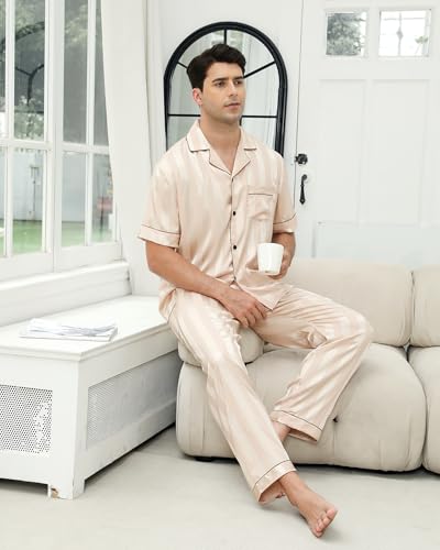 • Good Quality Material: The mens pajama set short sleeve is made of 95% polyester and 5% spandex, lightweight and breathable, soft and comfortable. Enjoy the silk-like feel of satin fabric in this classic satin pajama set for men