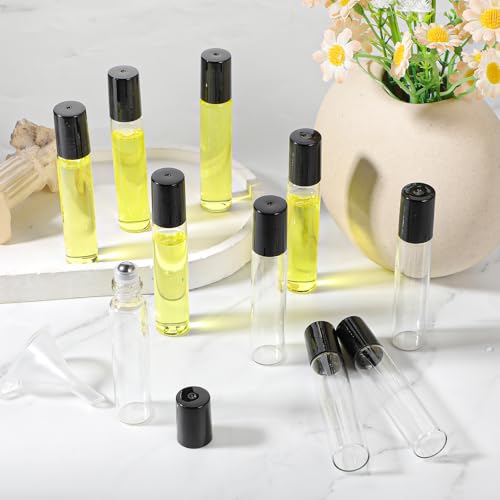 MAQUITA 100 Pcs Essential Oil Roller Bottles 10ml Empty Glass Roller Bottles with Stainless Steel Balls Protection Leakproof with 5 Funnel for Travel Perfume Lip Gloss (clear) 4