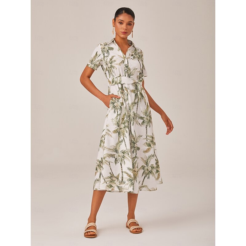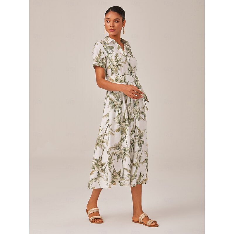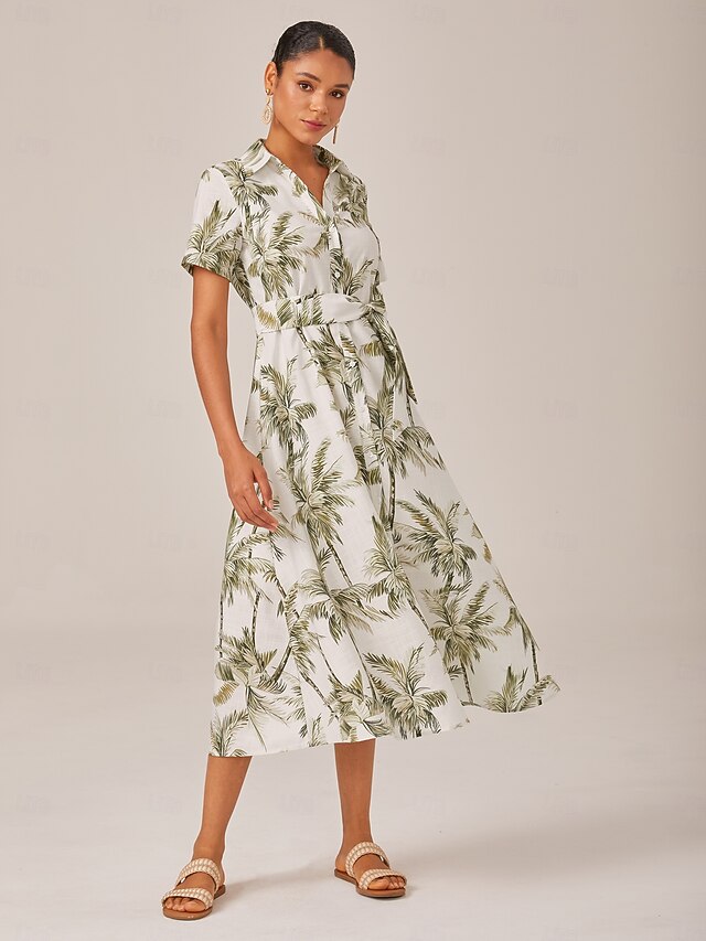 More information about Palm Print Linen Look Button Down Midi Shirt Dress