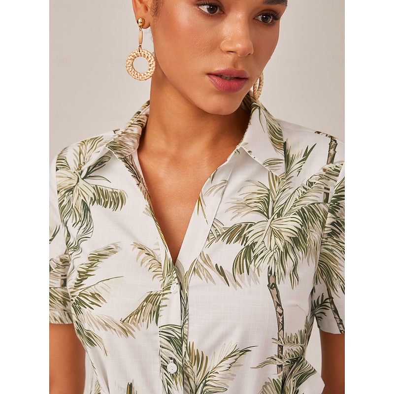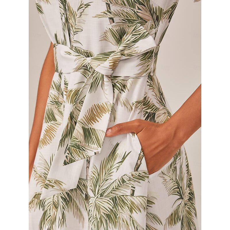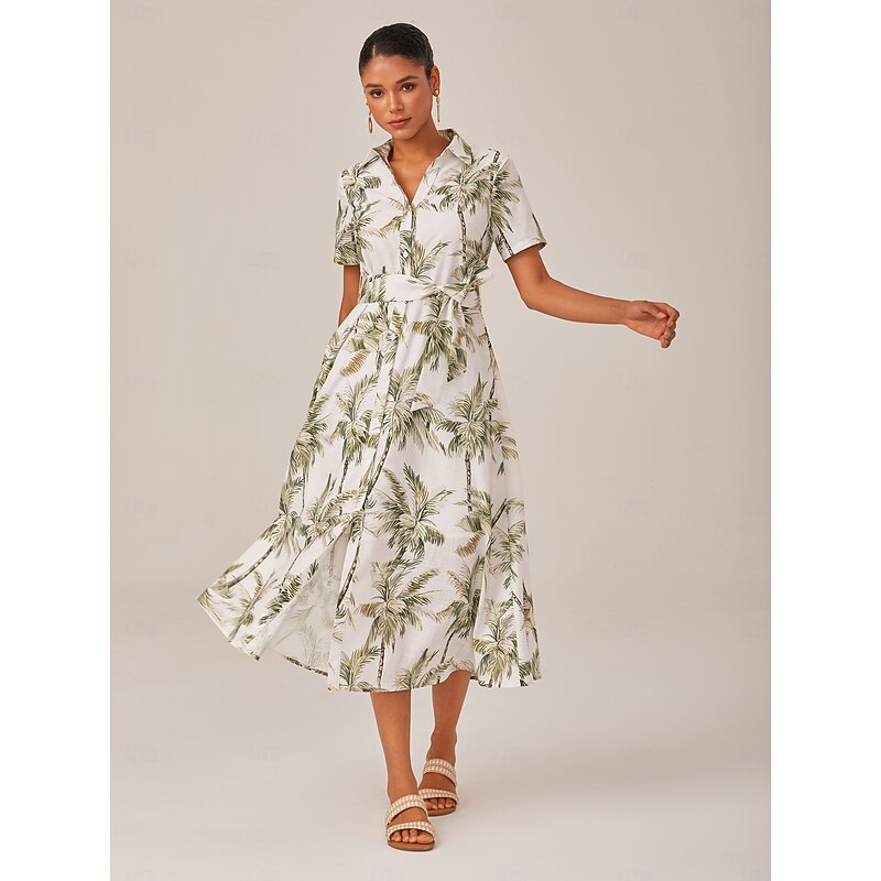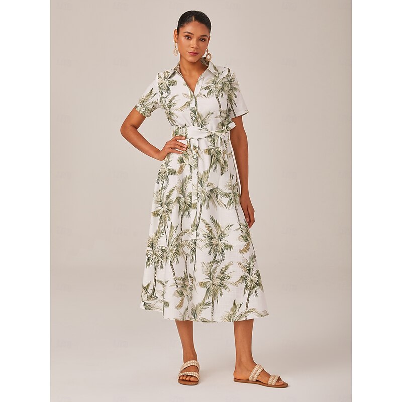HOT ! Palm Print Linen Look Button Down Midi Shirt Dress