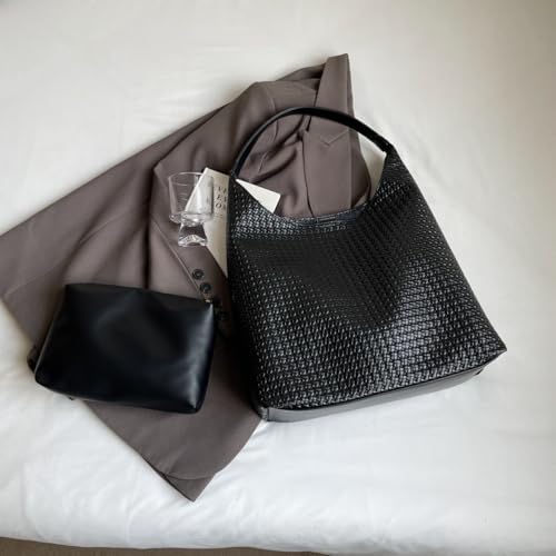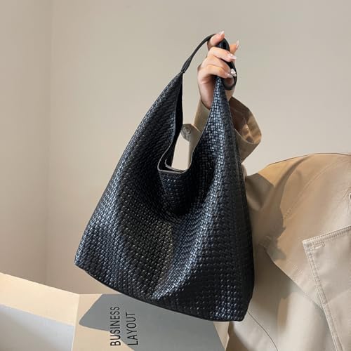 HOT ! Woven Tote Bag for Women Top-handle Shoulder Bag, Leather Woven Beach Bag Hobo Bags Soft Vegan Handbag Underarm Black