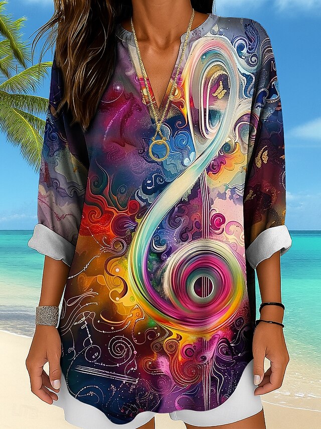 Music Festival Women's Blouse Long Sleeve Tunic Ombre Graphic Geometric Elegant Vintage Tropical Long Sleeve V Neck Regular Tops Daily Holiday Print White Red Rainbow Summer Spring 5