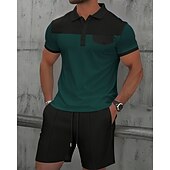 Men's T-shirt Suits 2 Pieces Outfits Tee & Shorts Short Sleeve Lapel Summer Color Block Fashion Casual Patchwork Pocket 2 Piece Vacation Daily Wear Going out Wine Dark Green khaki Top Tee for Men 3