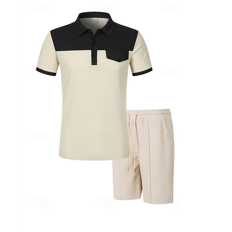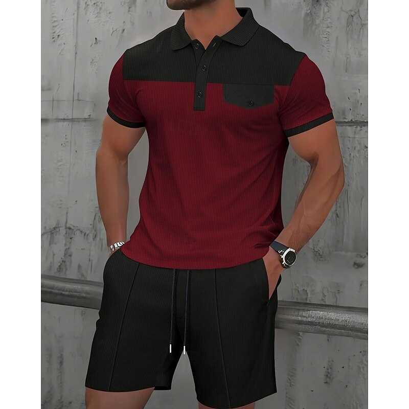 HOT ! Men's T-shirt Suits 2 Pieces Outfits Tee & Shorts Short Sleeve Lapel Summer Color Block Fashion Casual Patchwork Pocket 2 Piece Vacation Daily Wear Going out Wine Dark Green khaki Top Tee for Men