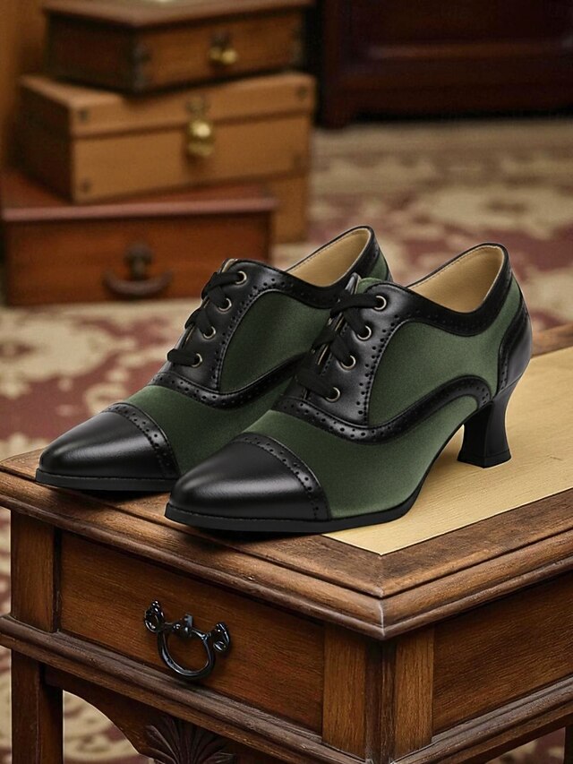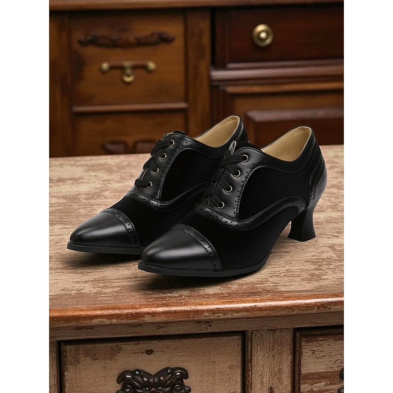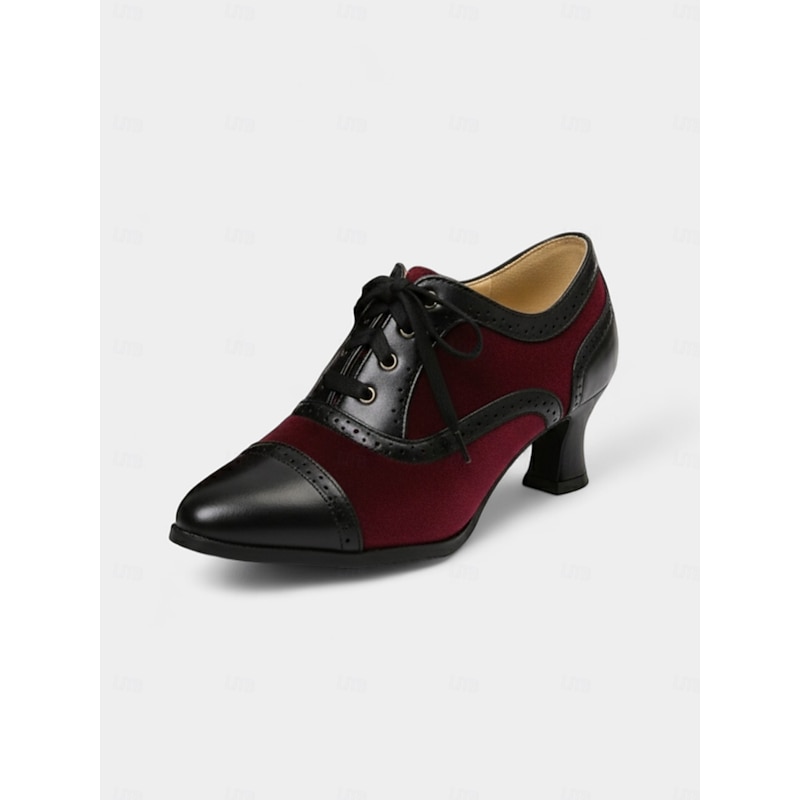 HOT ! Women's 1920s Edwardian Lace-Up Kitten Heel Oxford Shoes – Vintage Two-Tone Velvet and Faux Leather Brogue Pumps for Gatsby Party and Formal Wear
