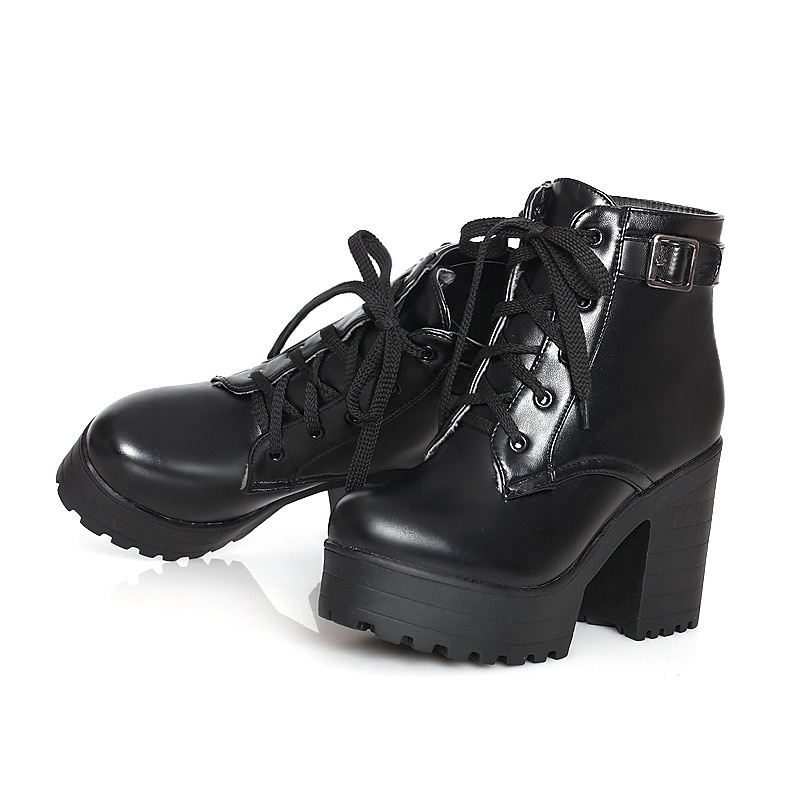 Featuring a trendy ankle-high silhouette, these boots combine a sleek lace-up design for a snug fit with chunky block heels. The platform heel ensures comfort while adding height, offering a modern and stylish twist to a classic boot style.