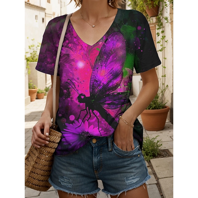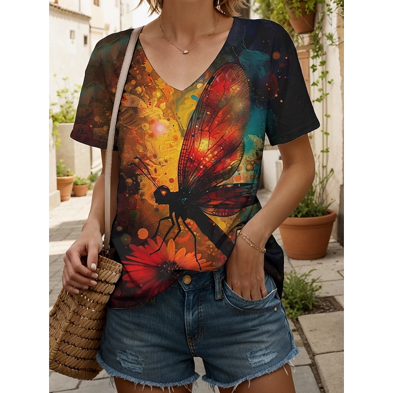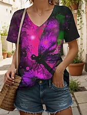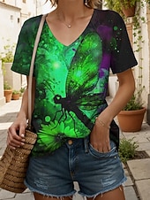 More information about Women's T Shirt Graphic Animal Dragonfly Vintage Stylish Classic Short Sleeve V Neck Regular Tops Daily Going out Weekend Print Black Red Blue Purple Green Summer Spring