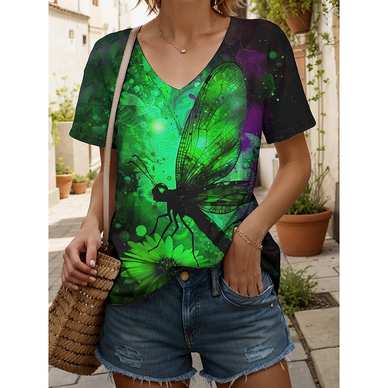 Women's T Shirt Graphic Animal Dragonfly Vintage Stylish Classic Short Sleeve V Neck Regular Tops Daily Going out Weekend Print Black Red Blue Purple Green Summer Spring 5