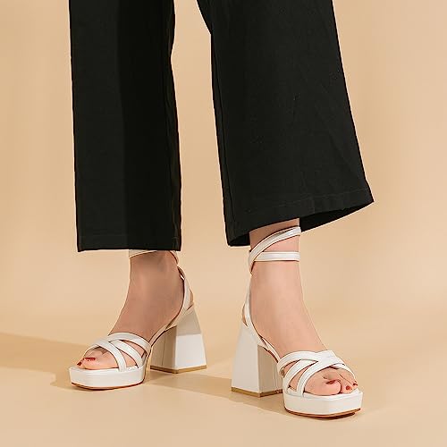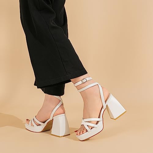Amoji Women's Platform Heels Chunky Dressy Block Thick Heels Prom Wedding Shoes 305 White 11 Women 4