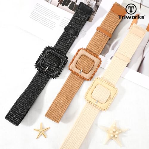 3 Pack Straw Woven Stretch Belt for Women,Raffia Elastic Belt for Dress Wide Boho Waist Belt with Square Buckle 3