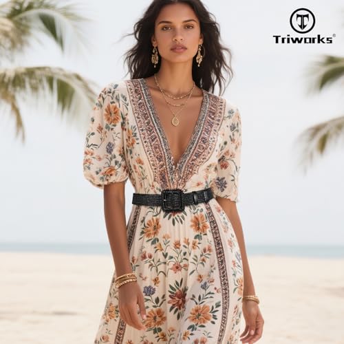 • Adjustable No-Hole Fit: Soft 1.57" straw elastic band with leather-edged tail adapts to waist sizes up to 45". Secure the lightweight square buckle (decorated with cute beads, unique and fashionable, full of boho style) for a snug, polished finish—no holes required.