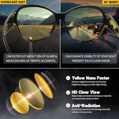 • Nighttime Safey Glasses: Our night driving glasses offer an anti-glare HD vision that can reduce strong reflected light. These eyeglasses are designed for you to travel safer at night or cloudy, rainy, foggy days, polarized yellow-tinted lenses effectively reduce glare caused intense lights, enhance clarity and alleviate eye fatigue.