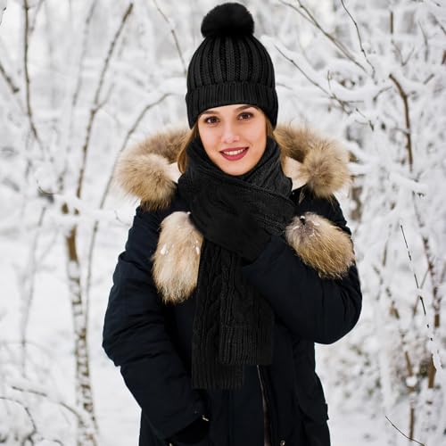 Winter Beanie Hat Scarf Gloves Set for Women Knit Touchscreen Gloves with Warm Pom Pom Satin Lined Hat Long Knit Scarf 3 In 1 5