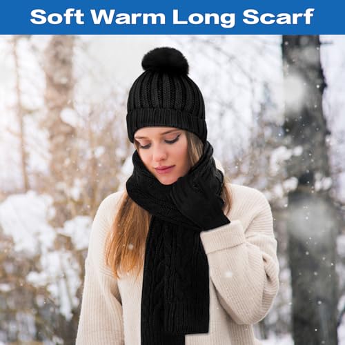 Winter Beanie Hat Scarf Gloves Set for Women Knit Touchscreen Gloves with Warm Pom Pom Satin Lined Hat Long Knit Scarf 3 In 1 6