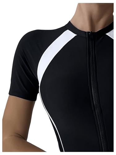OYOANGLE Women's Colorblock Zipper Front Sport One Piece Swimsuit Shorts Romper Bathing Suit Swimwear 1