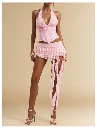 SOLY HUX Women's Mesh Irregular Ruffle Trim Layered Y2k Mini Skirt Concert Music Festival Date Outfits 2