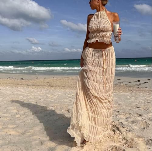 • Feature: Vacation clothes: Solid color, ruched detail, slim fit. Cami Tops: Sleeveless, backless, halter neck, tie closure. Long Skirt: Low waist, drawstring front, full-length; Sexy sheer mesh see through2pcs long skirts,high waisted skirts for women