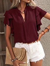 More information about Women's Shirt Blouse Solid Color Stylish Casual Short Sleeve Notched Neck Regular Tops Daily Ruffle Pink Wine Summer