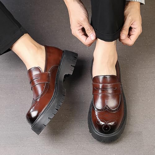 Men's Leather Wingtip Wide Round Toe Platform Loafers Classic Slip On Comfortable Anti-Slip Lug Sole Brogue Penny Loafers for Wedding Business Formal Prom 6