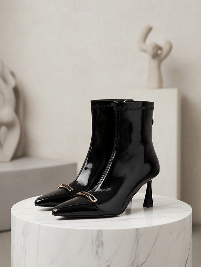 Women's Patent Leather Ankle Boots with Pointed Toe, Gold Buckle Detail and Stiletto Heels, Chic Urban Party Fashion Footwear 10