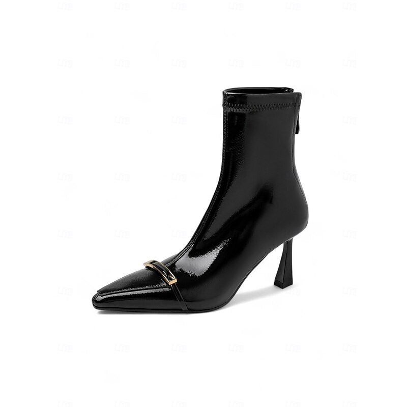 Women's Patent Leather Ankle Boots with Pointed Toe, Gold Buckle Detail and Stiletto Heels, Chic Urban Party Fashion Footwear 1