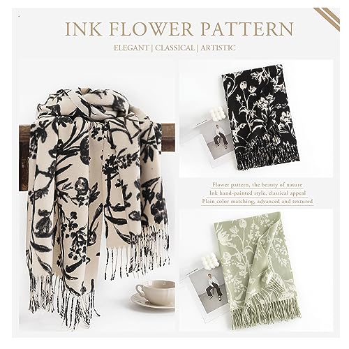 Winter Cashmere Shawl - Women's Ink Flower Pattern Pashmina With Tassel, Long Neck Scarf, Soft Warm Wrap Stole 4