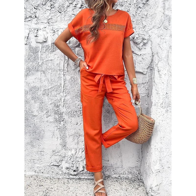 Why Choose Women's Fashion Shirt Linen-Inspired Sets Two Piece Sets Pants Trousers Short Sleeve Round Neck Solid Color Drawstring Casual Daily Black Orange Green Spring & Summer Regular Fit?