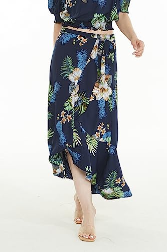HOT ! Matchable Women's Hawaiian Print Smock Top and Wrap Ruffle Skirt in Pineapple Garden Navy