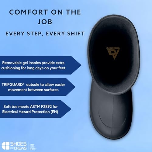 • ALL-DAY COMFORT: EVA in the insole, midsole and upper keeps weight down and flex up—so your boots work with you, not against you. Shock-absorbing for long shifts. Just don't store these non-slip shoes near heat—EVA breaks down fast. Fits true to size.