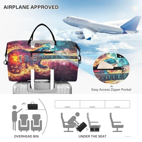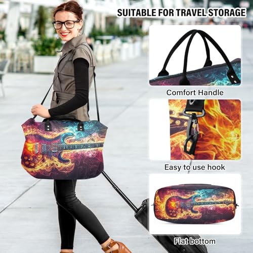 HOT ! Large Travel Duffel Bag, Guitar Fire Blue Sport Tote Gym Bags, Shoulder Weekender Overnight Bags for Women Men, Carry On Luggage with Toiletry Bag