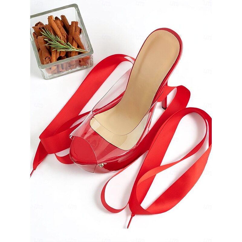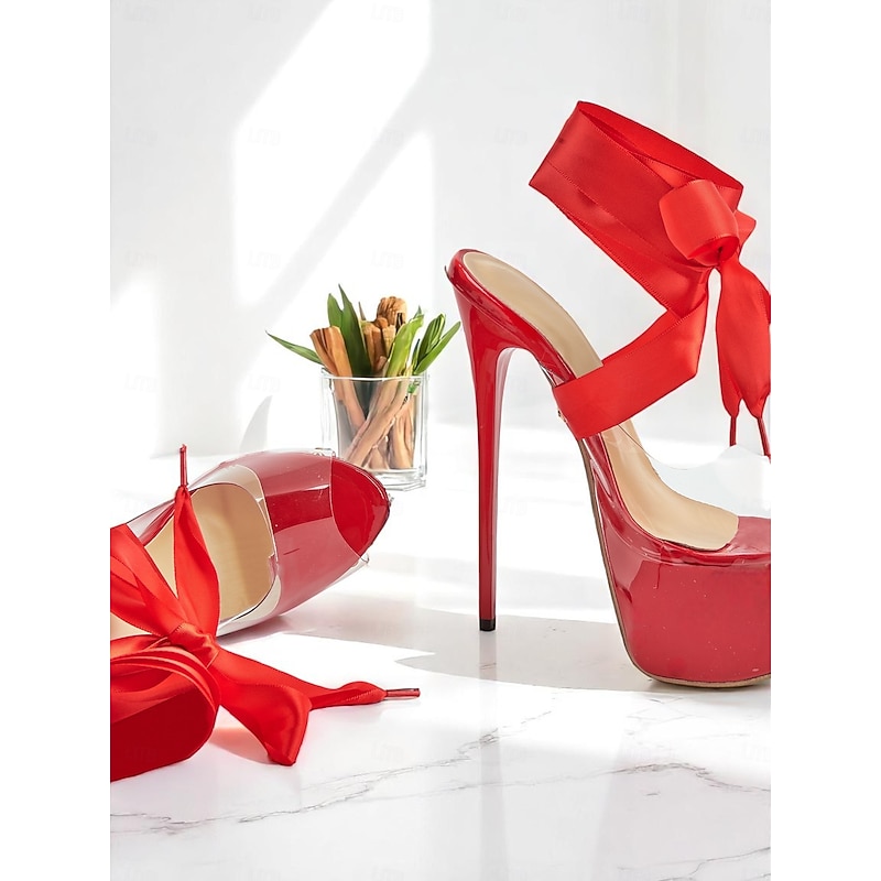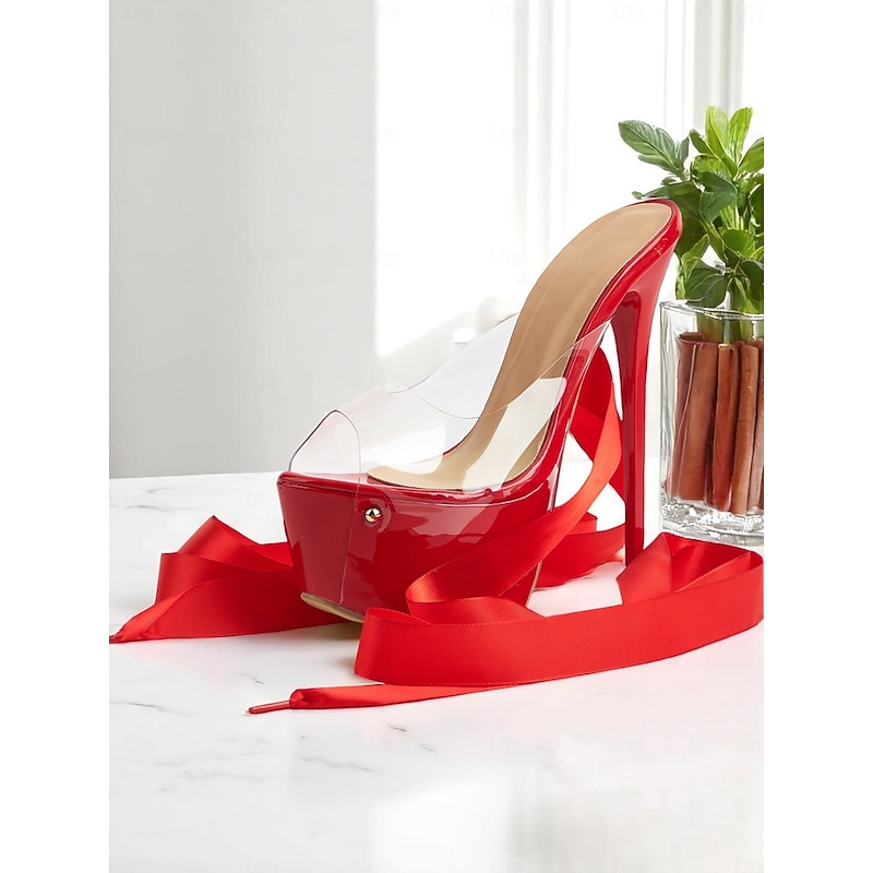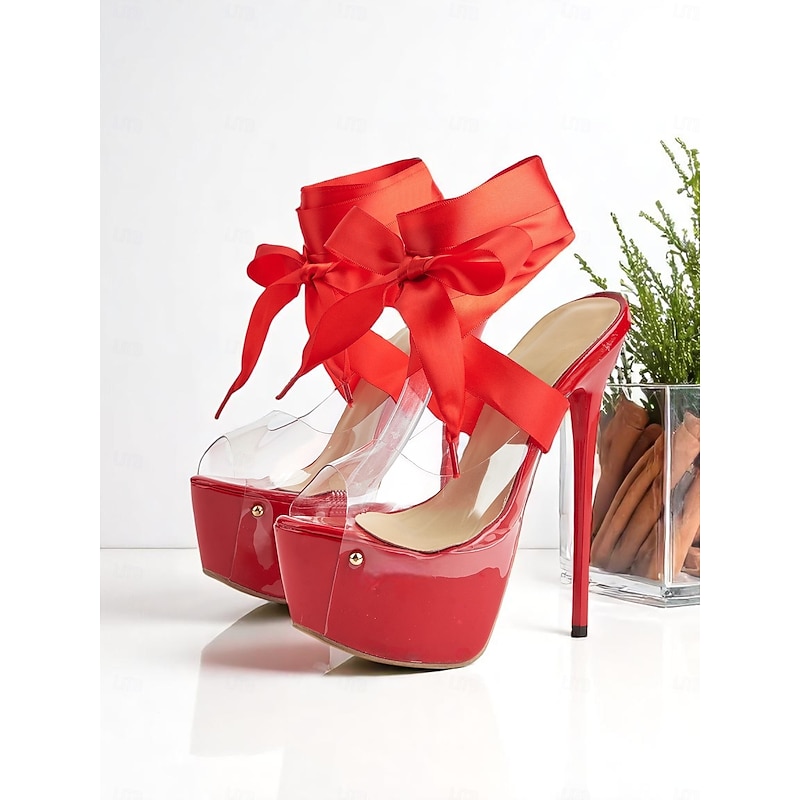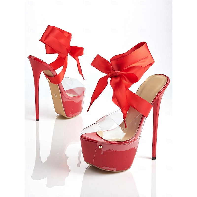 HOT ! Women's Black Clear Platform Heels with Satin Ankle Tie - Sexy High Heels for Nightlife Parties and Evening Events