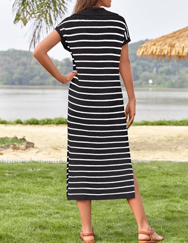 ZESICA Women's Summer Striped Midi Dress 2025 Casual Short Sleeve V Neck Loose Knitted Side Slit Long Sweater Dresses 4