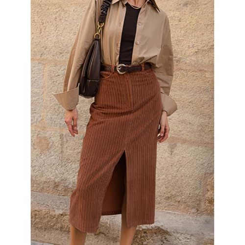 • Design Description: Corduroy midi skirt designed with a front slit and straight hem delivers a sleek slim fit silhouette, blending classic tailoring with a casual streetwear aesthetic that enhances your everyday style