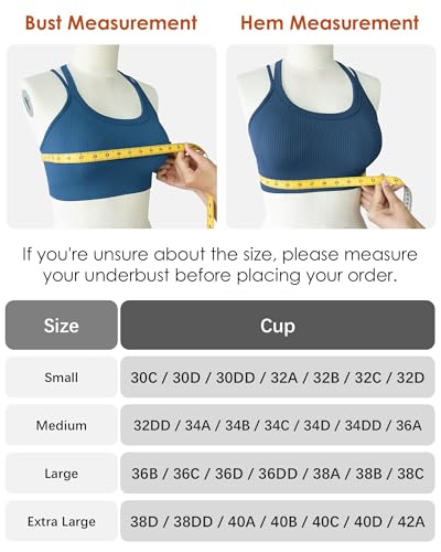• 【Multi Colors & Packages for Choose】Our sports bras for women have lots of available cute colors and practical cost-effective color sets to meet your various need,like white sports bra,black sports bra,blue sports bra etc. These supportive sports bras for women have 4 sizes : S (30C 32A 32B 32C 32D 32D); M ( 32DD 34A 34B 34C 34D 34DD 36A); L (36B 36C 3 6D 36DD 38A 38B 38C); XL( 38D 38DD 40A 40B 40C 40D 42A)
