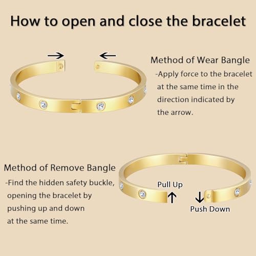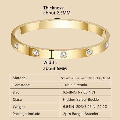 Material: Stainless SteelMetal type: Stainless SteelClasp type: Hidden Safety ClaspChain type: Solid BandGem type: Cubic Zirconia【 Exquisitely Crafted 】Crafted from hypo-allergenic surgical-grade 316L stainless steel, this gold bracelets for women is durable, tarnish-resistant, and safe for sensitive skin. Featuring sparkling round cubic zirconia stones, it symbolizes eternal love and enhances your beauty. Gold bangles are crafted with smooth edges,shiny surface. Lightweight yet sturdy, it’s perfect for daily wear and can be easily paired with other jewelry. A timeless piece that adds elegance to any outfit.【 Easy to use 】The 2Pcs Bangle Bracelets for women features a concealed clasp design that enhances its aesthetic appeal while ensuring a secure, slip-resistant fit on the wrist. Crafted in Stainless Steel, the Cubic Zirconia love gold bracelets are exceptionally user-friendly: to open or close, gently pull the top section with your index finger while simultaneously pressing the bottom part with your thumb, allowing effortless wear and removal.【 Suitable Size 】The circumference of the cross love bangle bracelet is 16.6 cm ( 6.54 inches), the width is 6 mm, and the innerdiameter is approximately 4.9 cm x 5.8 cm (1.94 inches X 2.29 inches) , which is suitable for small to medium wrists,and the bracelet is of moderate weight and offers a comfortable fit【 Perfect gifts for women 】Simple yet retro love bangle bracelets must be wonderful gifts for youself, mother, girlfriend, best friend, wife, etc. Suitable for birthday, Valentine's Day, Christmas, Mother's Day, Anniversary, etc【 Satisfaction service 】If you have any questions about the bangle bracelets for women, please feel free to contact us. We will replied within 24 hours and offer you the best solution Perfect for everyday use. supreme materials and excellent craftsmanship ensure long-lasting durability.